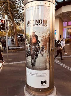 Sergio Brodsky, RMIT UniversityNoisy, ugly and dirty. Advertising has polluted cities, annoyed consumers, and jeopardised its own existence. Beyond a mass-media cacophony, brand communications’ significant carbon footprint and runaway consumption are certainly contributing to what economists call market failure. Advertising, even when not promoting consumption, creates an environmental cost because of its emissions. Author providedIn the UK, for instance, advertising produces 2 million tonnes of carbon dioxide emissions a year. That’s equivalent to heating 364,000 UK homes for a year, according to CarbonTrack. In this sense, should messages such as a City of Melbourne campaign inviting people to cycle more even be allowed? On the one hand, it is better to communicate a solution (cycling) to the issue than not. On the other, if the communication contributes to the problem more than the solution, what’s the point of it? Jerry Seinfeld’s 2014 infamous line at the Clio awards called out the advertising sector to its face: